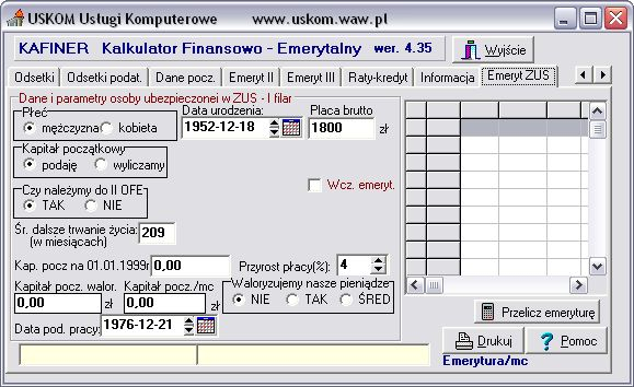 Kalkulator finansowo-emerytalny KAFINER jest prostym programem, przy pomocy którego można liczyć wypłatę netto, płacę brutto, składki ZUS, odsetki od należności, oszczędności, ustawowe i podatkowe, emerytury II i III filaru oraz kredyty bankowe o ratach równomiernych i malejących. Program jest regularnie uaktualniany co zapewnia zgodność z aktualnym stanem prawnym.